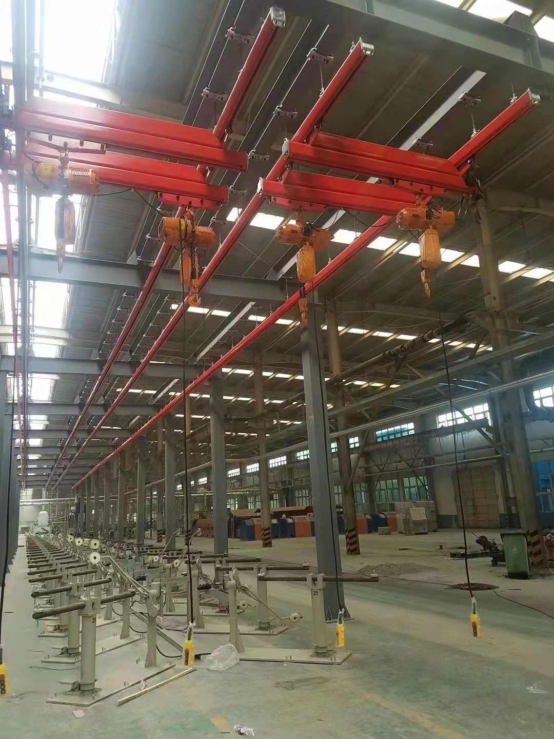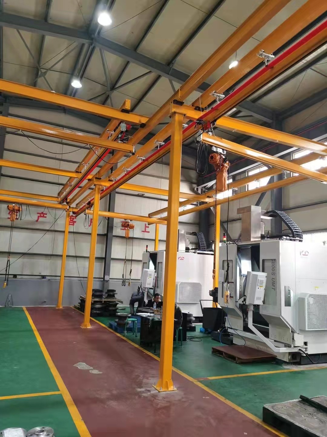 KBK起重機標(biāo)準(zhǔn)組件。由懸掛裝置、軌道、道岔、行走小車、電動葫蘆、移動供電裝置(滑線)以及控制裝置等組件組合而成,起升裝置主要采用環(huán)鏈電動葫蘆,也可吊掛一些機械手或焊槍之類,作為工具滑軌使用,起重量一般不超2000kg。