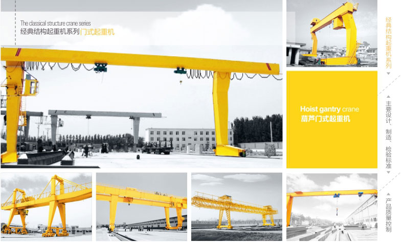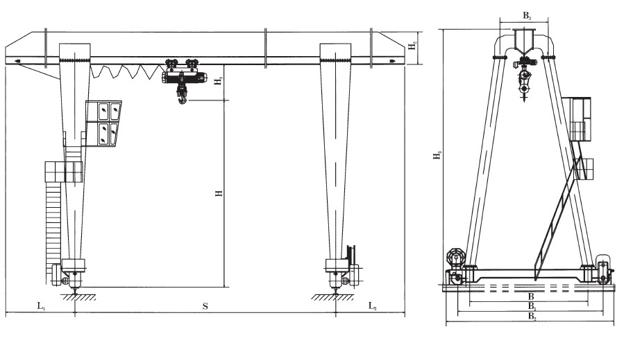 1、 MH型電動葫蘆門式起重機與CD1、MD1等型號的電動葫蘆配套使用,是一種有軌運行的中小型起重機。