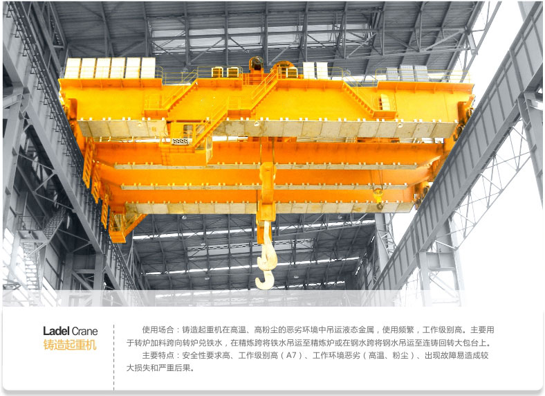 1、 鑄造起重機是煉鋼連鑄工藝中的主要設備。主要用于吊運和轉運液態(tài)鋼包。
